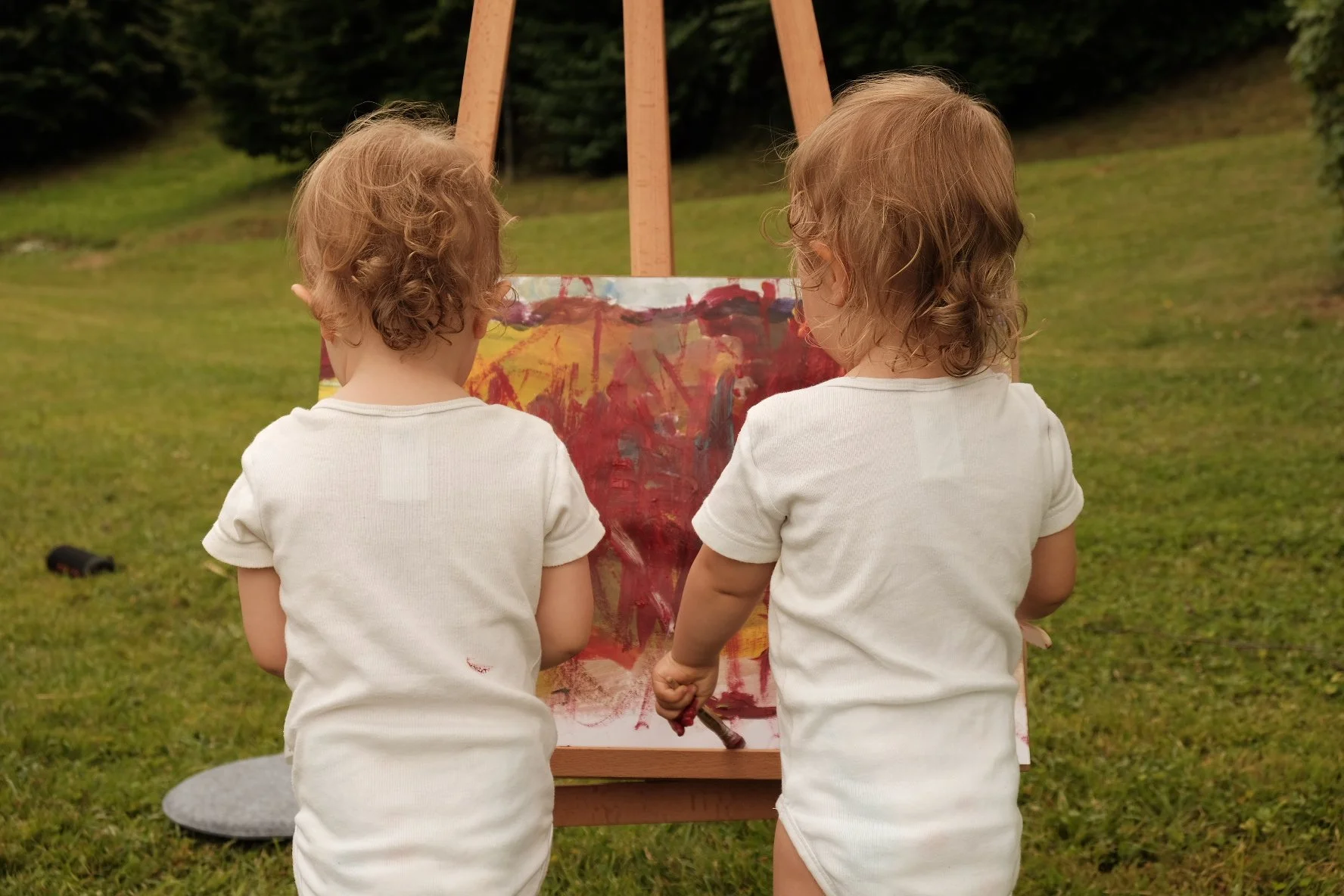 Kinder malen an einer Staffelei mit hochwertiger Acrylfarben und anderen Materialien. Sie können sich mit Farbe und Techniken ausprobieren, spielen und Freude an der Kunst erleben.